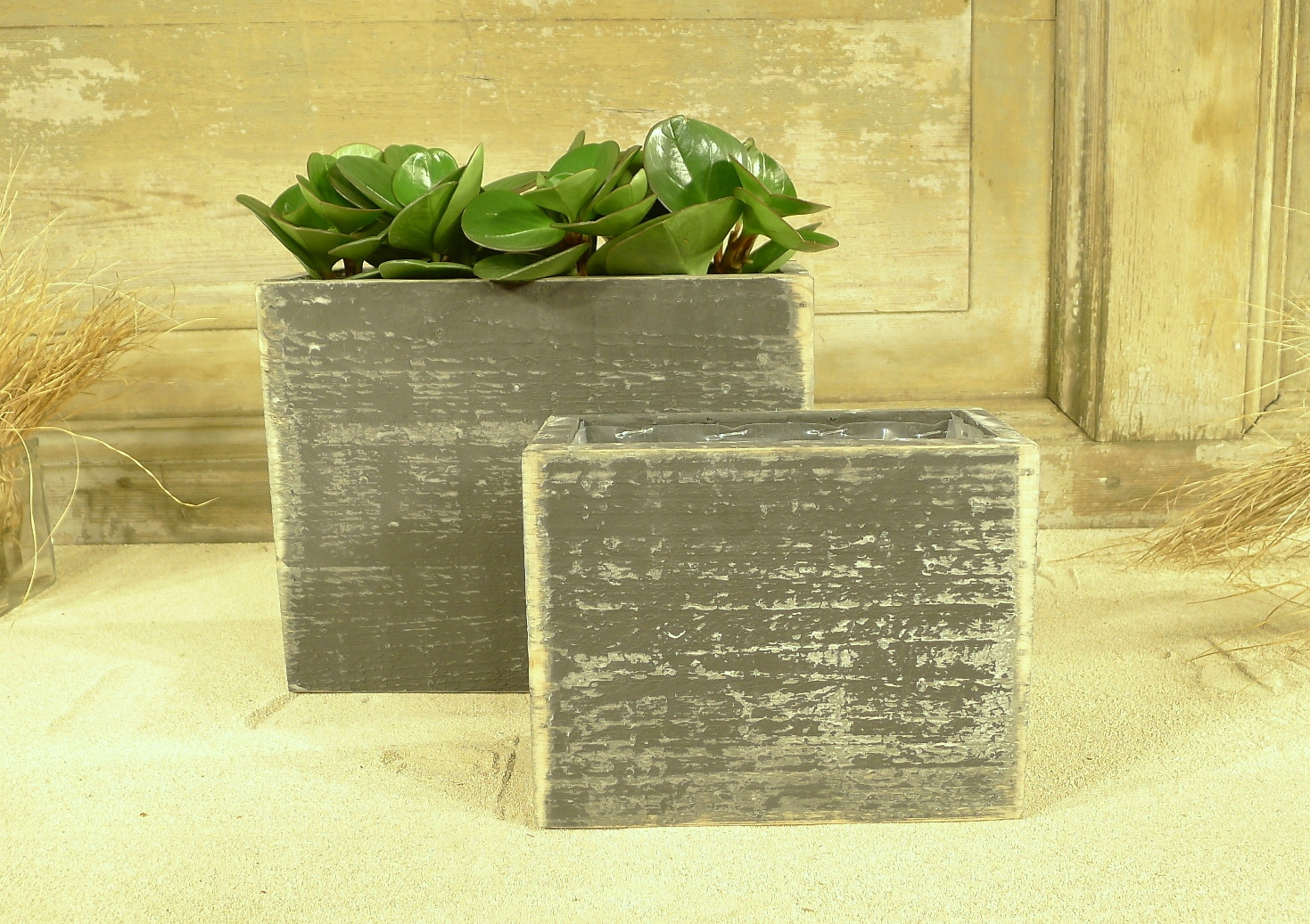 Ein einfach aussehender Behälter kann einen großen Unterschied in der Atmosphäre ausmachen. Es gibt genug einfache Holzbehälter; es geht hauptsächlich um die farbe und in diesem fall um das schwarze berlin finish. So mattschwarz und durchlebt sieht es fast aus wie Metall. Besonders dies in Kombination mit dem frischen Grün von Blumen und Pflanzen. Die Schönheit der Pflanze wird durch diese Veredelung weiter unterstrichen. Dann passt diese Variante (Breite außen 13 / innen 10 cm) auch genau zu den Gläsern und Vasen, die in Kürze neu in unserem Sortiment sein werden. Der Topfboden wurde angehoben, sodass Durchmesser und Länge für Topfgröße 9/10 übereinstimmen. Wenn Sie den Topf umdrehen, ist der Boden etwas höher, so dass die Vasen etwas darüber herausragen.