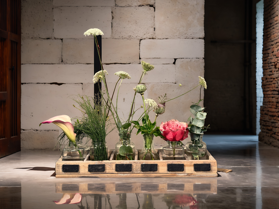 Tablett für 6 Gläser. Für jedes Glas ist eine Kreidetafel angebracht (Foto: Kreidetafel auf dem Tablett). Die Rückseite ist 2 cm höher als die Vorderseite. In dieses Fach passen mehrere Töpfe, sodass mehrere Anwendungen möglich sind. Wir können 3 Modelle dafür liefern: