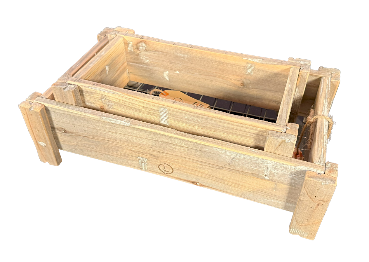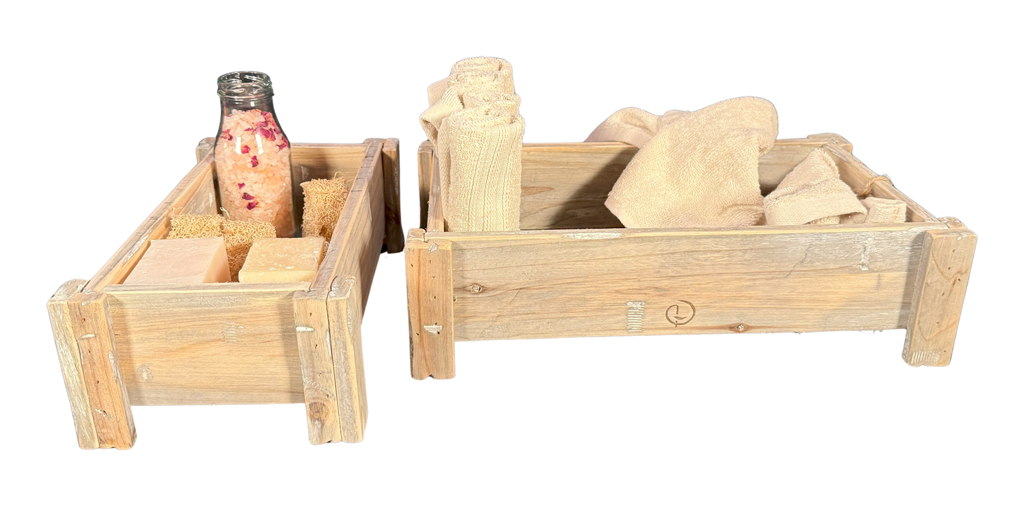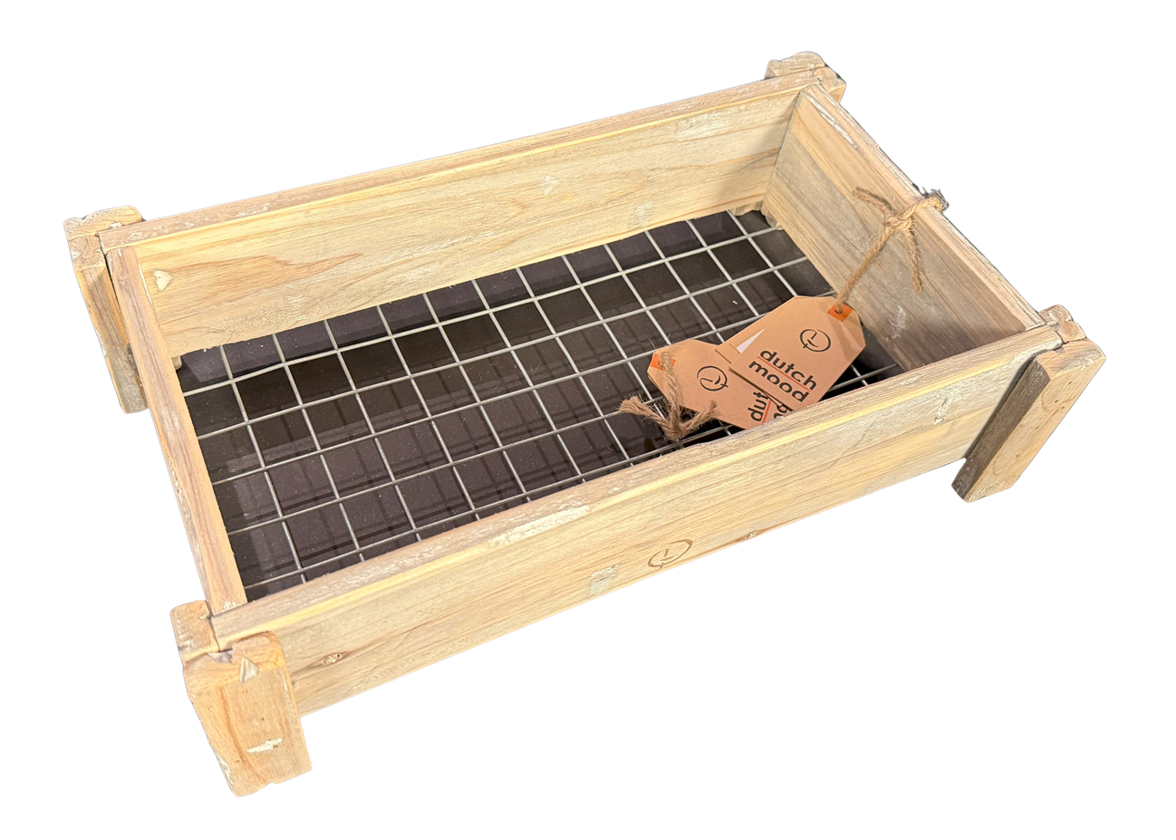 A bathroom box made of wood and mesh in a rough look. From a unique series; products like this don't exist that often. Especially in a sterile bathroom this looks really cool. It brings a bit of a natural world of stone and steel. It is also practical. In most boxes or baskets water remains, which makes everything wet. In this tray the water immediately drains away.