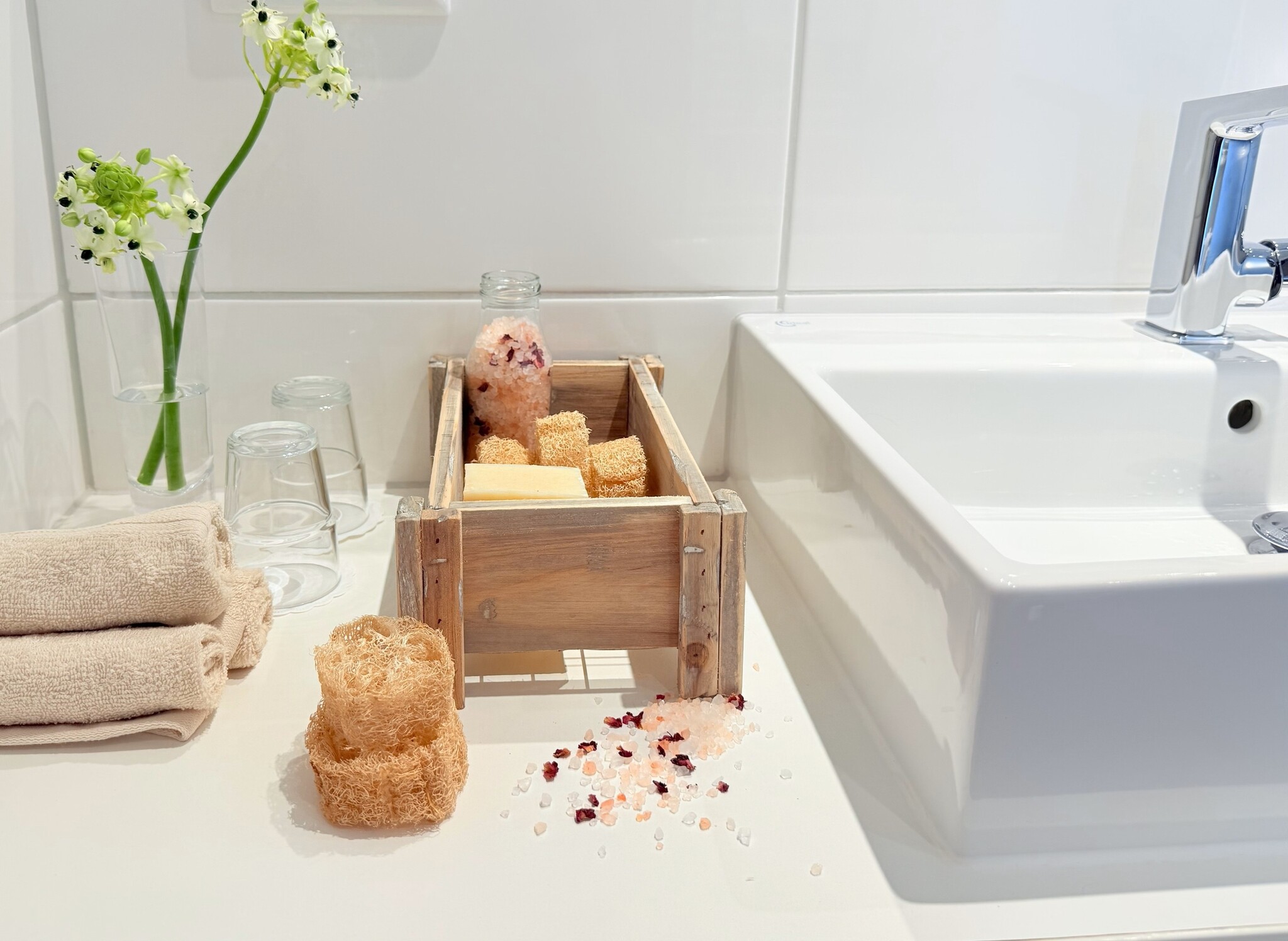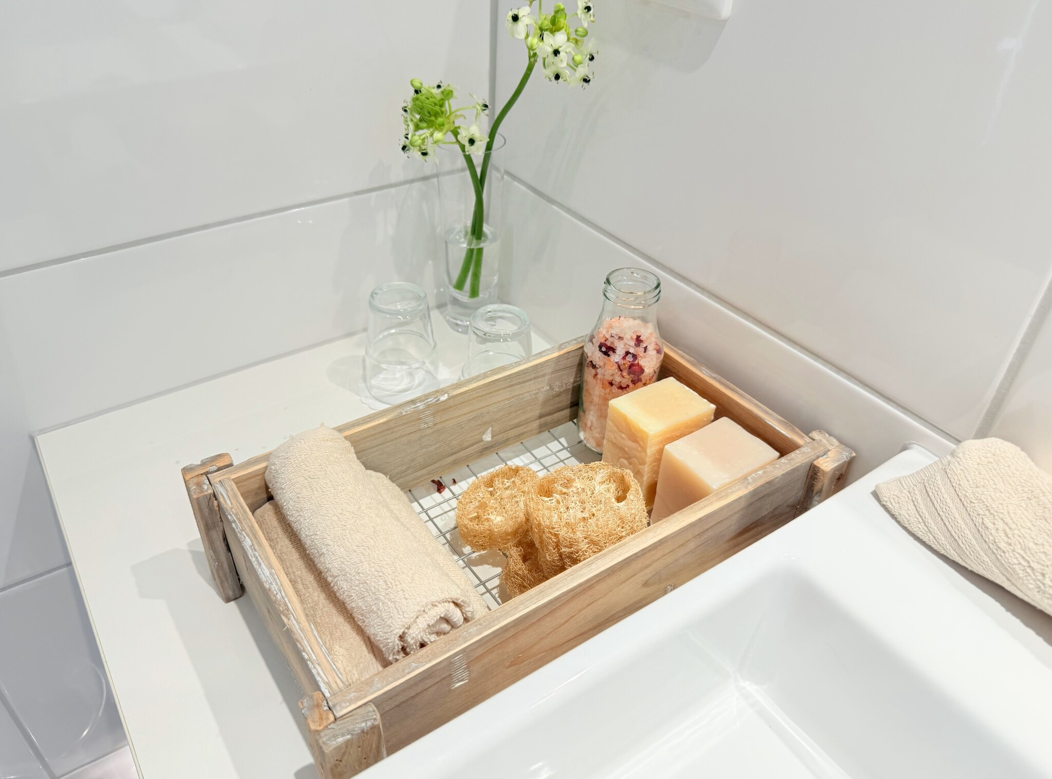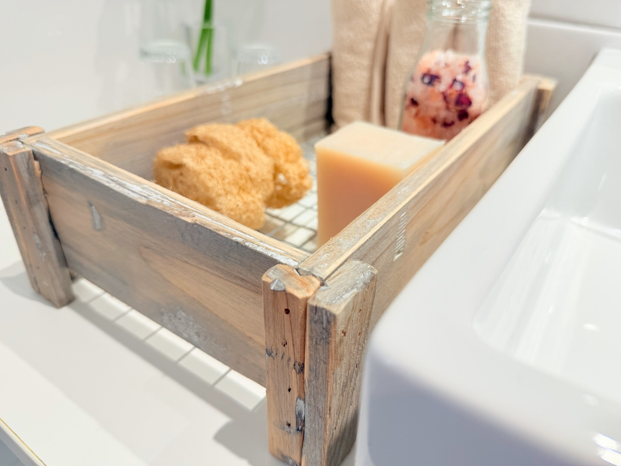 A bathroom box made of wood and mesh in a rough look. From a unique series; products like this don't exist that often. Especially in a sterile bathroom this looks really cool. It brings a bit of a natural world of stone and steel. It is also practical. In most boxes or baskets water remains, which makes everything wet. In this tray the water immediately drains away.
