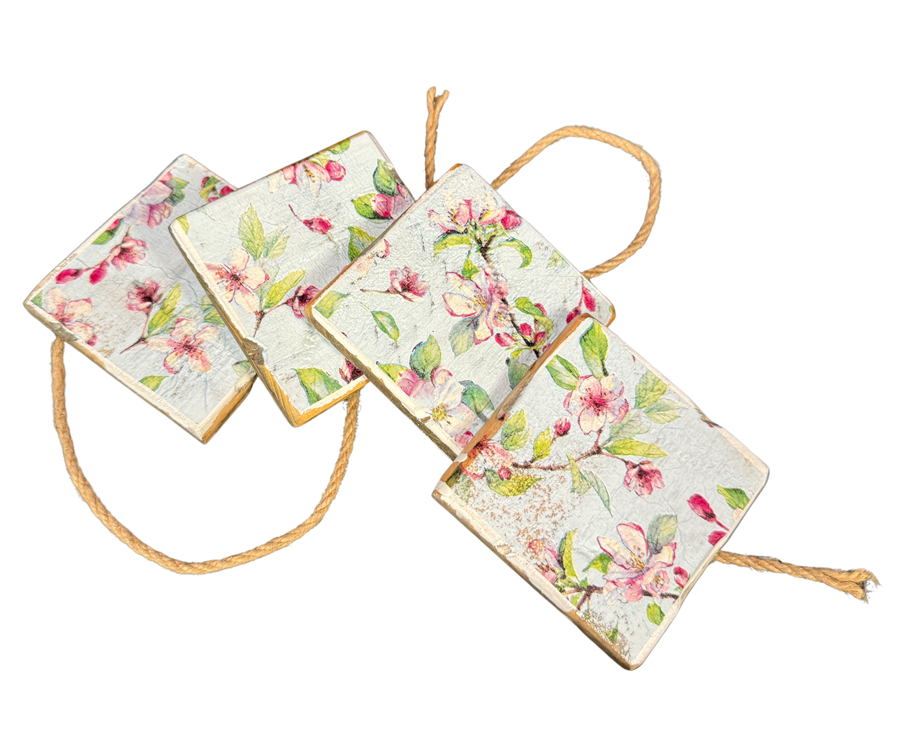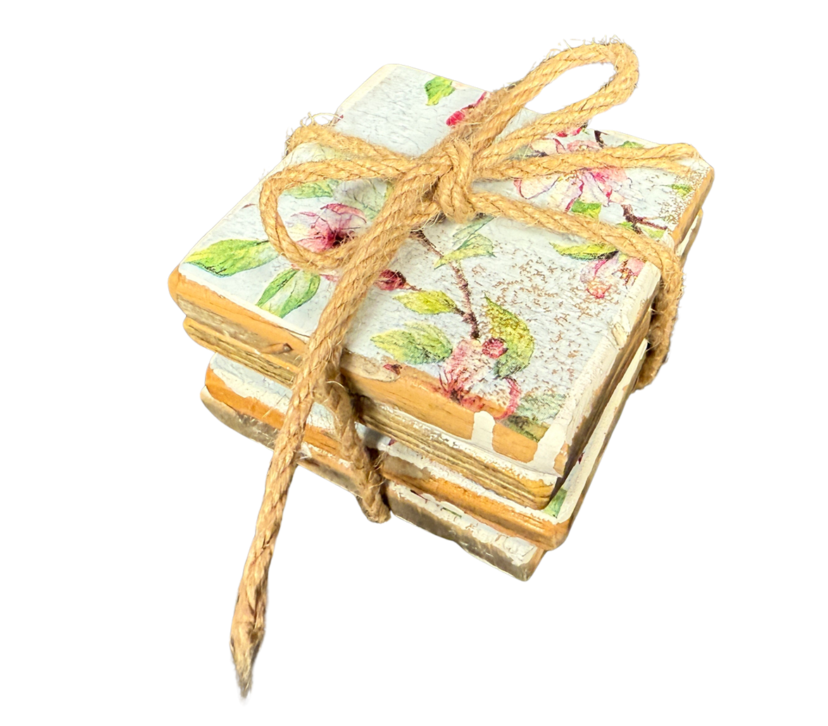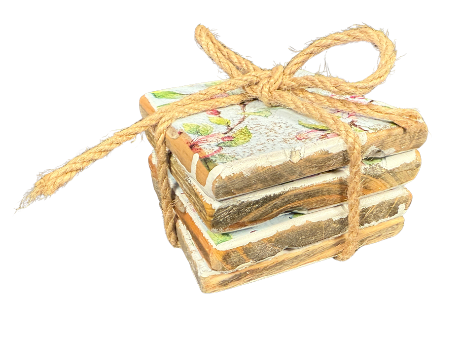 Coasters per bundle of 4 pieces tied in rope. 9 x 9 x 1.0 cm (size of 1 coaster).