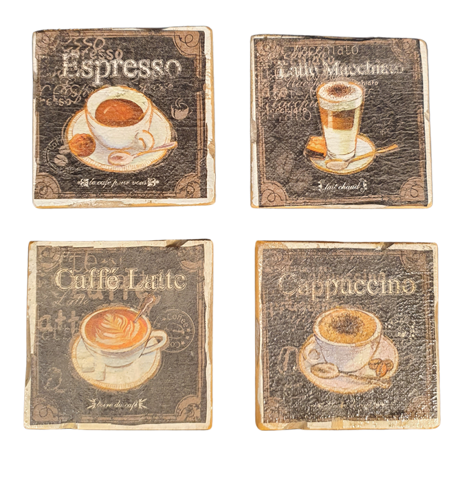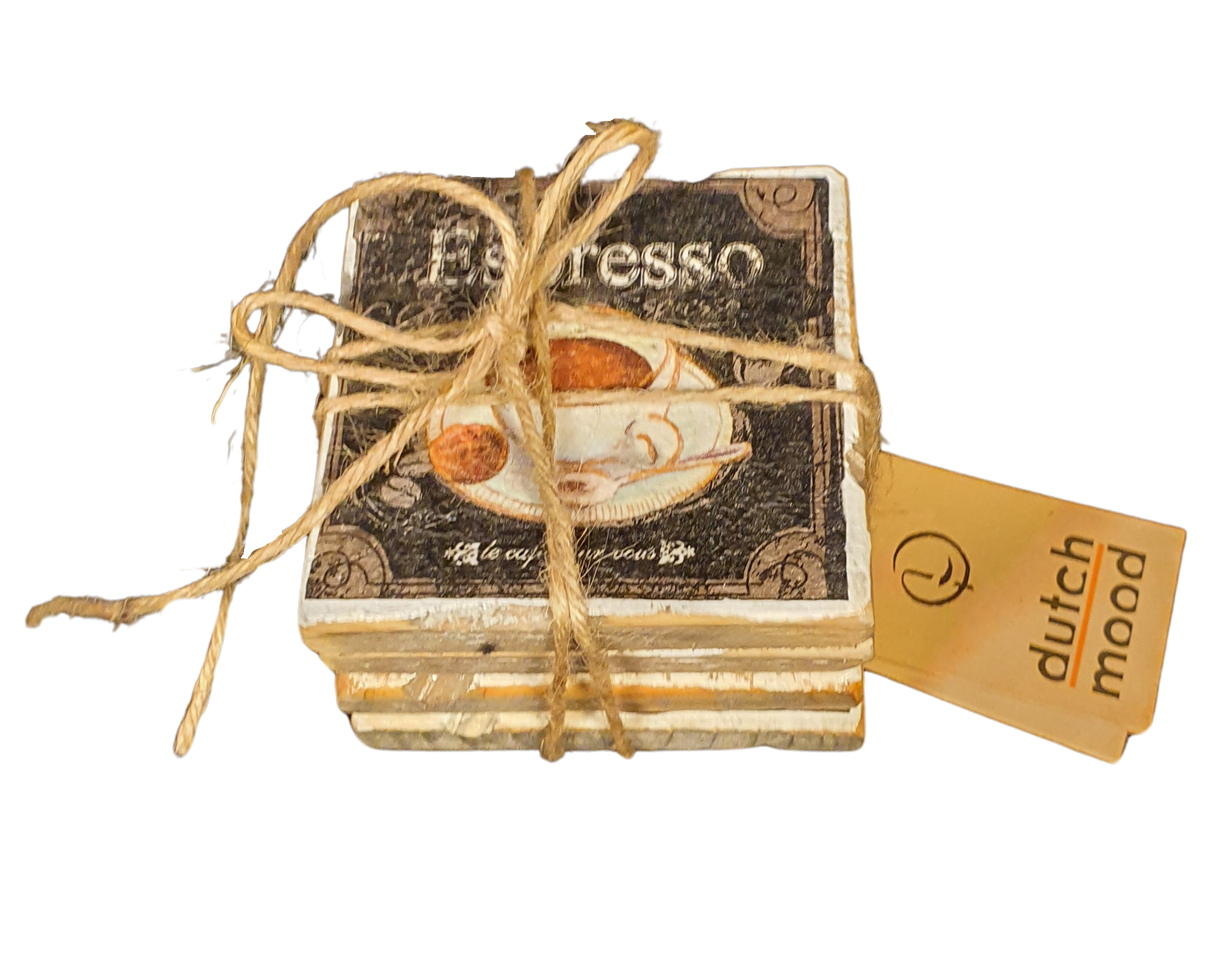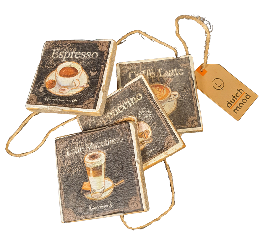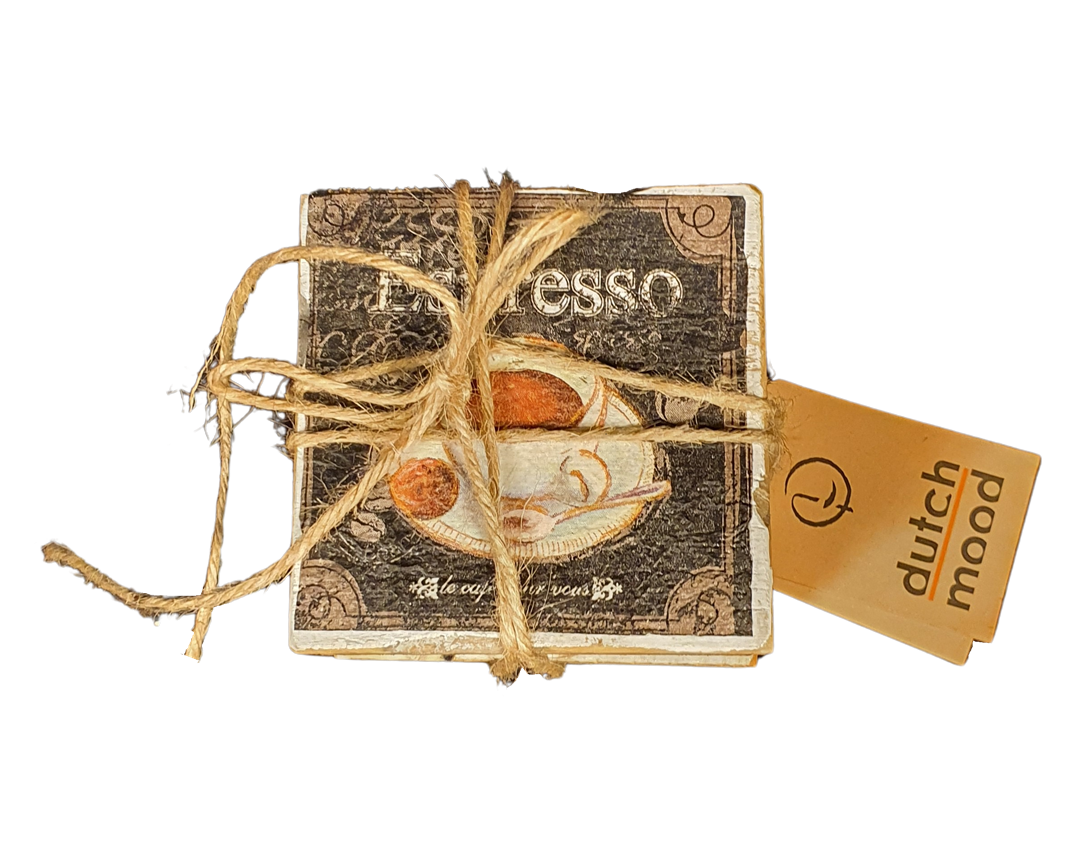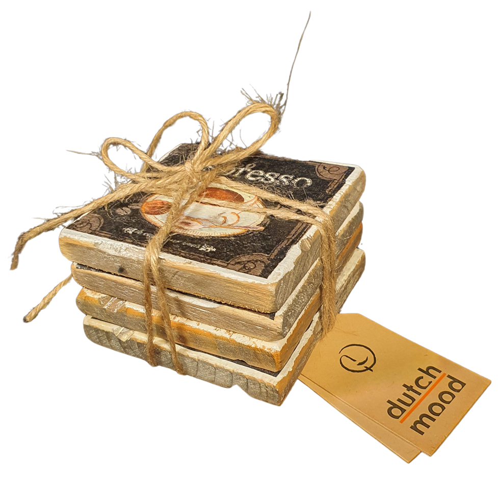 Coasters in a package with rope.Made as an old tile, but with the advantages of wood: no scratches on the table and light in weight.2x 2 different designs in the same color.These coasters can also be beautifully presented in a specially designed tray.See product: 404107 and 404108. All packages of coasters are provided with an EAN code per bundle.