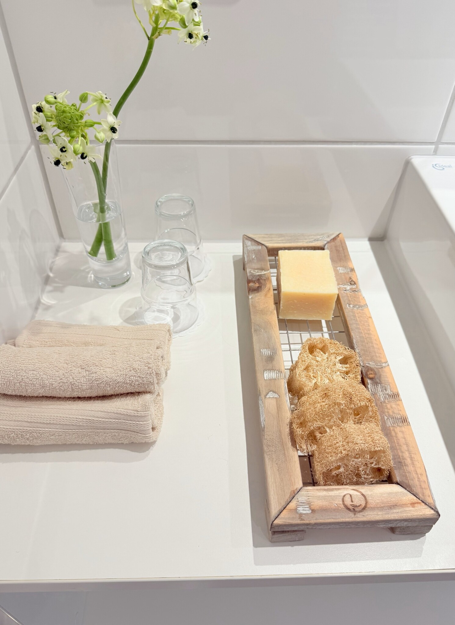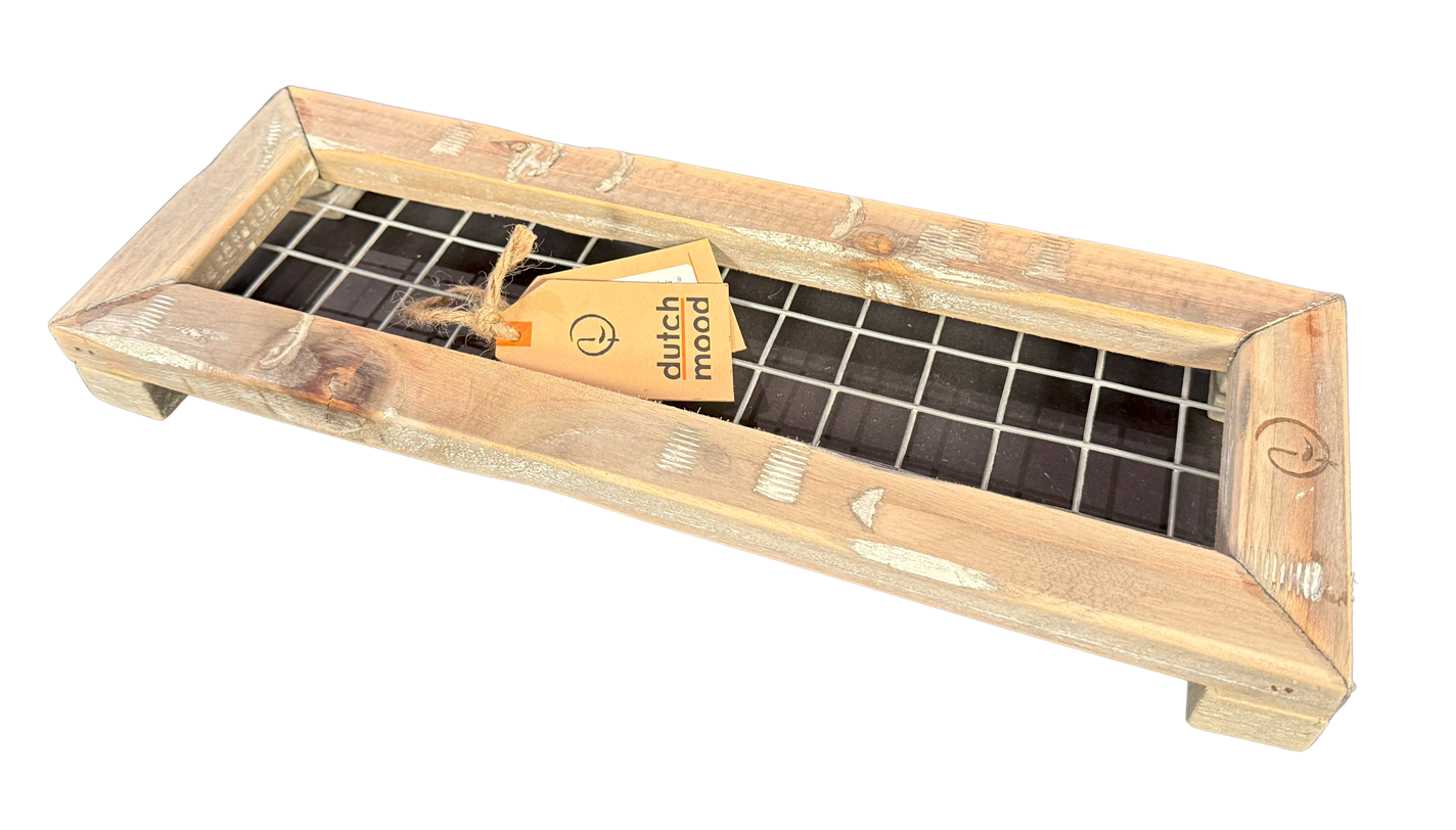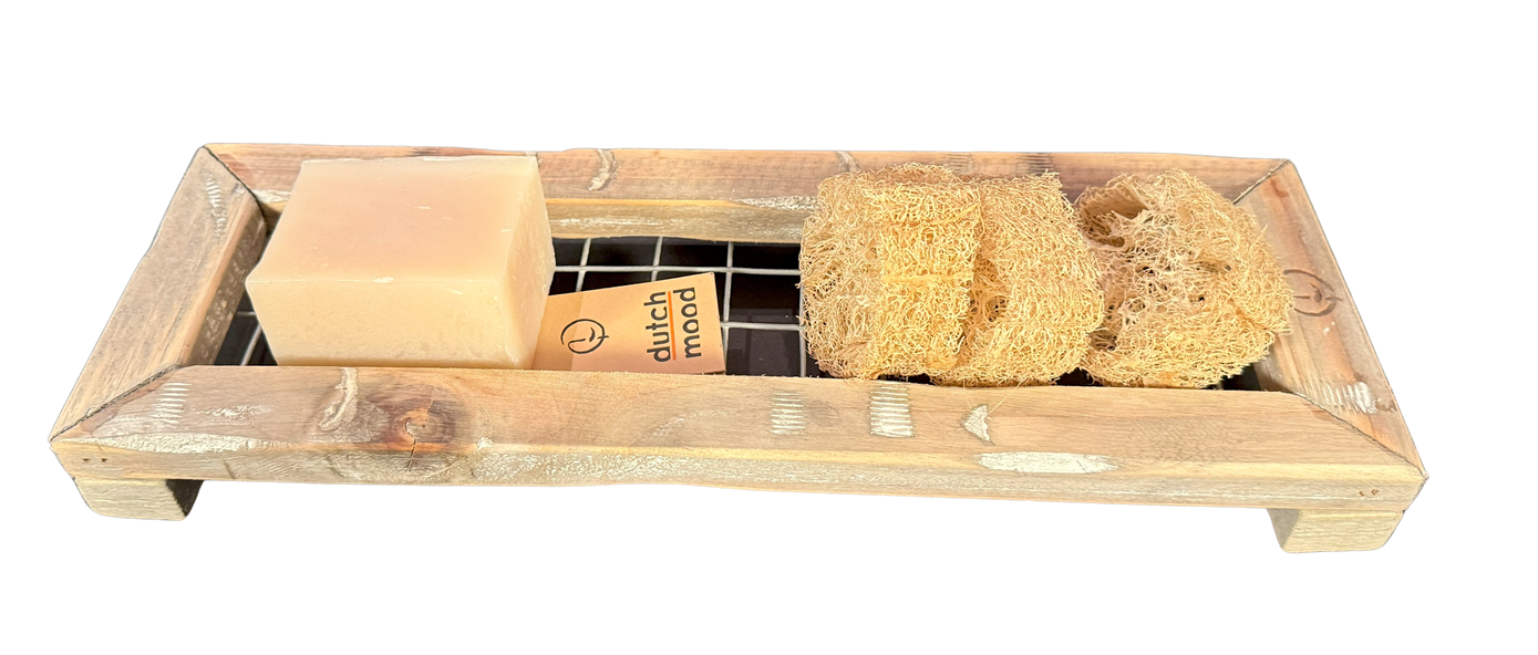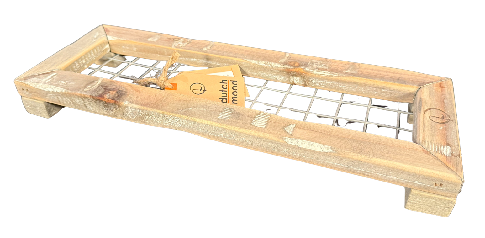 A soap dish made of wood and mesh in a rough look. You don't see this often. Especially in a sterile bathroom this looks really cool. It brings a bit of a natural world of stone and steel. In addition, it is also practical. In most soap dishes water remains, causing the soap to dissolve. In this tray the water immediately falls away. This is the large version for more soap or sponges, etc.
