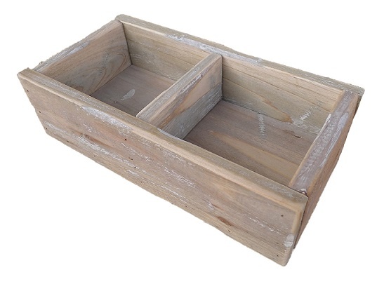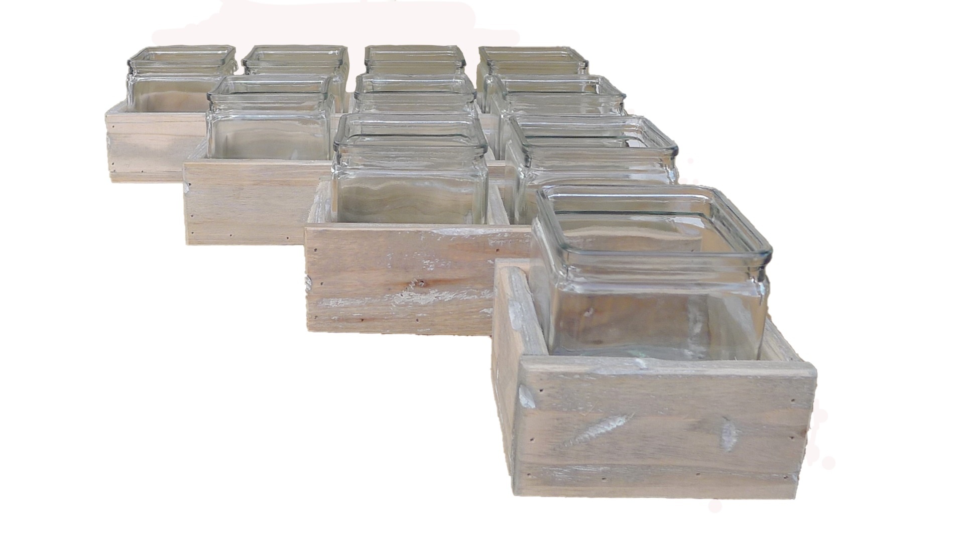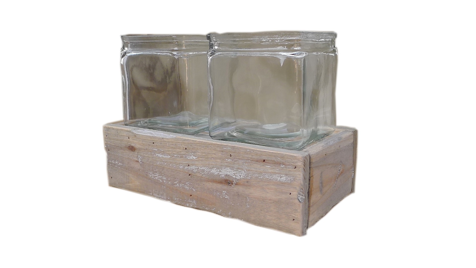 2 Glazen accubakjes in houten tray. Het glas komt mooi uit in het matte hout. Het houten bakje is ook fijn afgewerkt. Je kan het als vaasje, bloempotje, of kandelaar gebruiken. Wil je de potjes/vaasjes hoger zetten, dan kan je simpelweg het houten bakje omdraaien en het glas daar op zetten.