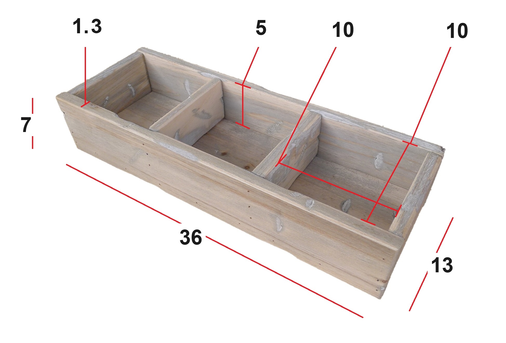 glazen accubakje in houten tray. 36x13x12cm