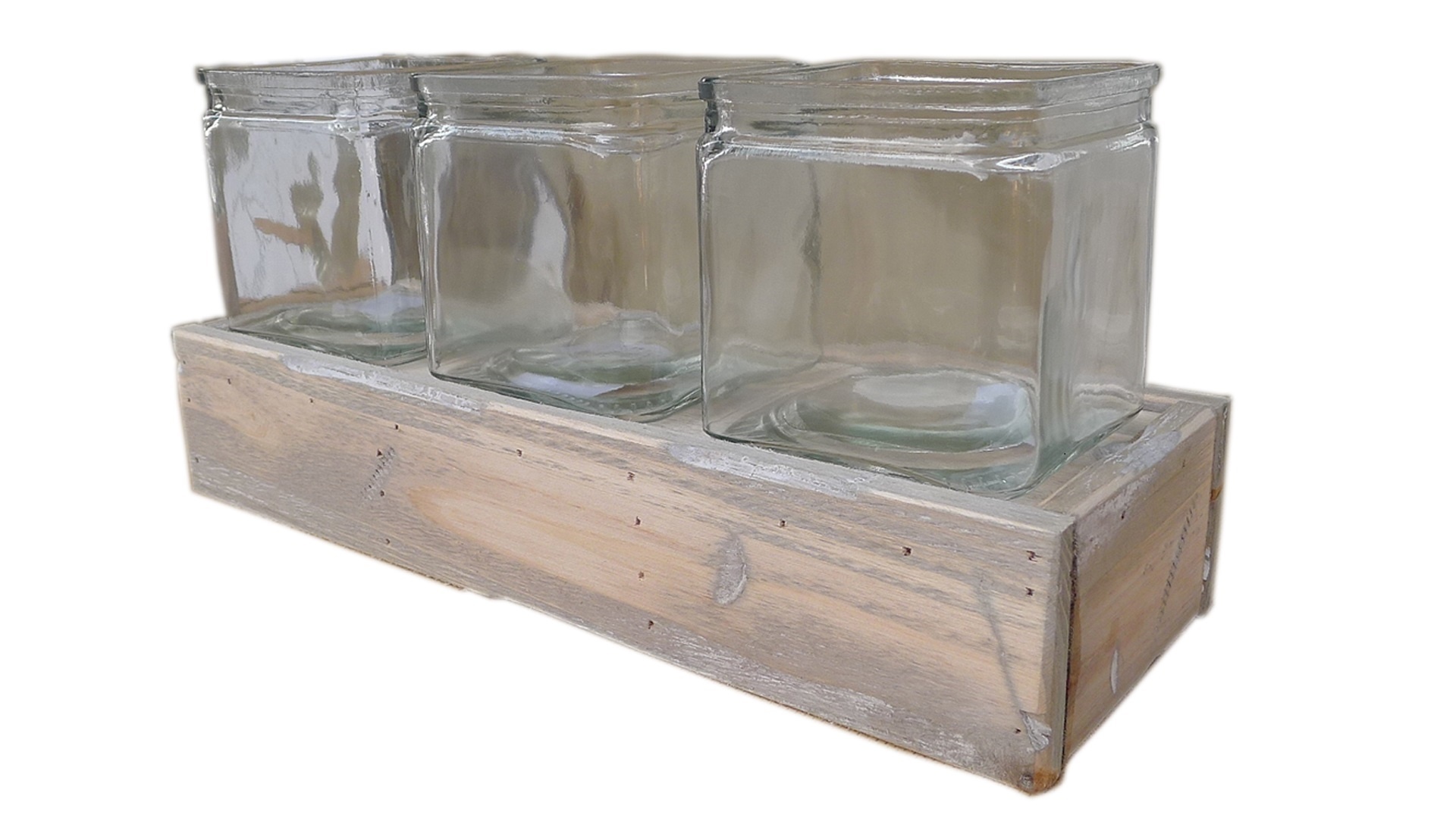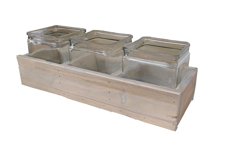 3 Glazen accubakjes in houten tray. Het glas komt mooi uit in het matte hout. Het houten bakje is ook fijn afgewerkt.  Je kan het als vaasje, bloempotje, of kandelaar gebruiken. Wil je de potjes/vaasjes hoger zetten, dan kan je simpelweg het houten bakje omdraaien en het glas daar op zetten.