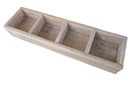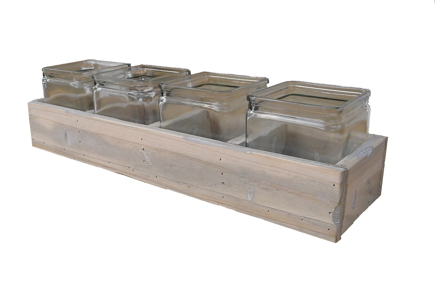 4 Glazen accubakjes in houten tray. Het glas komt mooi uit in het matte hout. Het houten bakje is ook fijn afgewerkt. Je kan het als vaasje, bloempotje, of kandelaar gebruiken. Wil je de potjes/vaasjes hoger zetten, dan kan je simpelweg het houten bakje omdraaien en het glas daar op zetten.