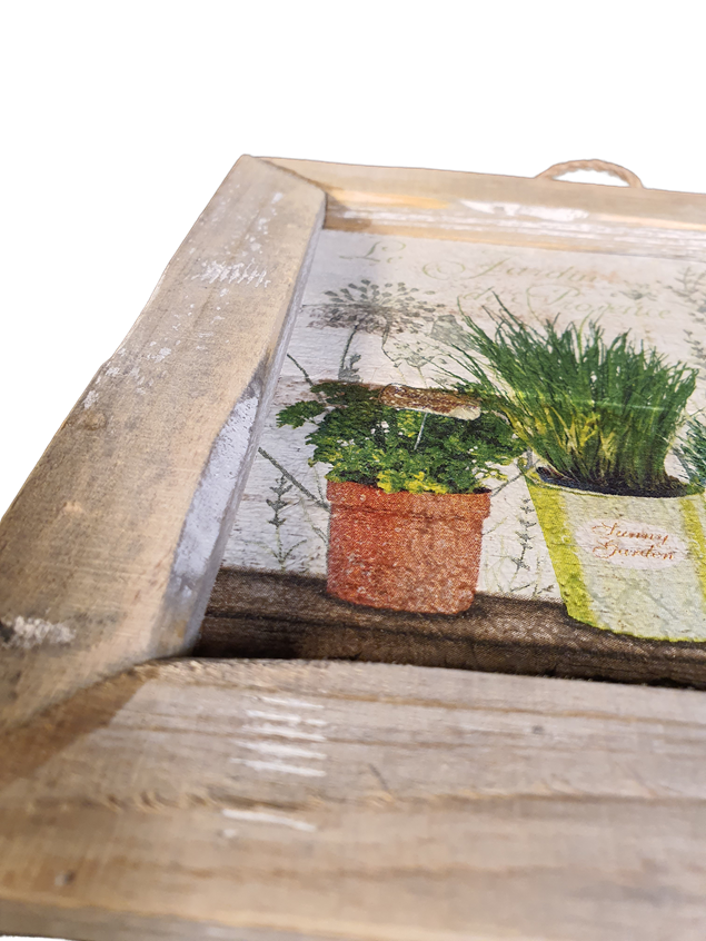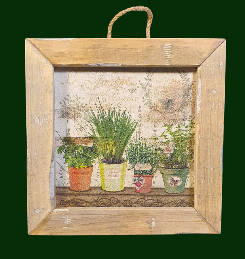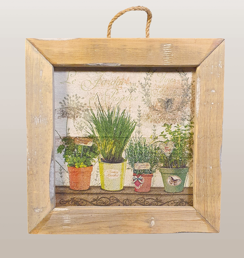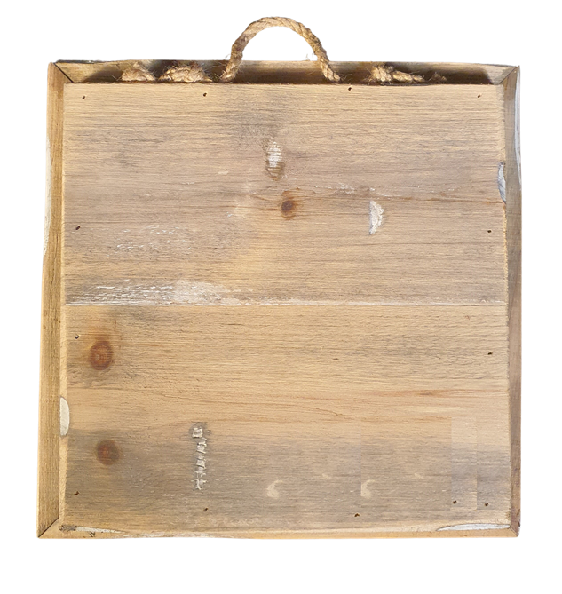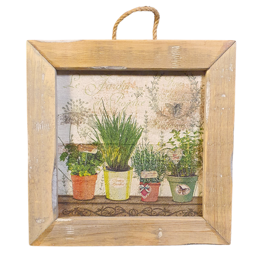 Een houten tegeltje in een ruige houten frame. Dat iets zo kleins ineens zoveel sfeer kan brengen. De tegel lijkt net een hand geschilderd ceramische tegel, maar het is hout. Aan de achterkant is een touwtje gemaakt, waaraan het met een schroef of spijker opgehangen kan worden. Het formaat is 22 x 22 x 3.5 cm, zodat het nog net in speciale brievenbuspost doos kan. Het tegeltje kan dus als alternatief voor een grote kaart verzonden worden.